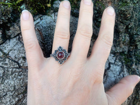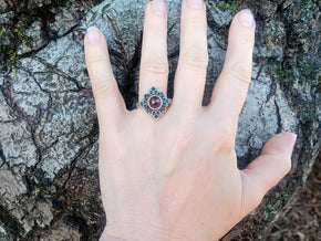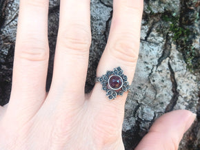 Garnet is said to strengthen love, passion and relationships. It has additionally been worn as a talisman for protection. Our Red Garnet Lavalliere is made with a camel colored leather cord and measures 16' inches in length with an extender chain that brings the total length to 18 1/2 inches. The natural stone measures 10 × 7. The amulet is made of polymer clay and antiqued-silver-plating.