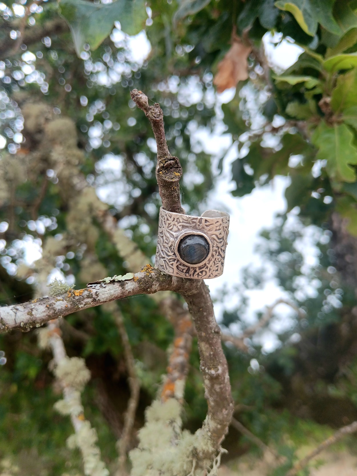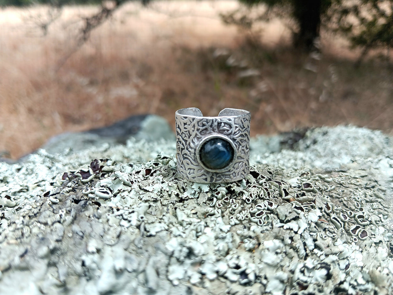 Something about wearing labradorite makes us feel like we're a wise, ancient sage.  The beautiful iridescent stone is thought to protect one from negativity and channel positive spiritual energy.  The semi-precious stone is natural, 8mm in circumference and the ring is adjustable for sizes 7 and up.  The design is made of silver-plated brass.