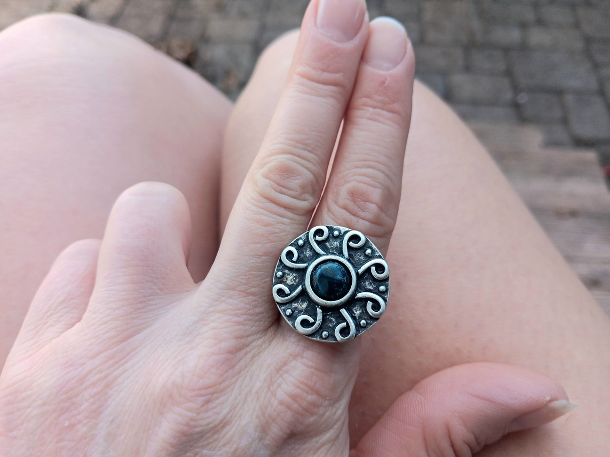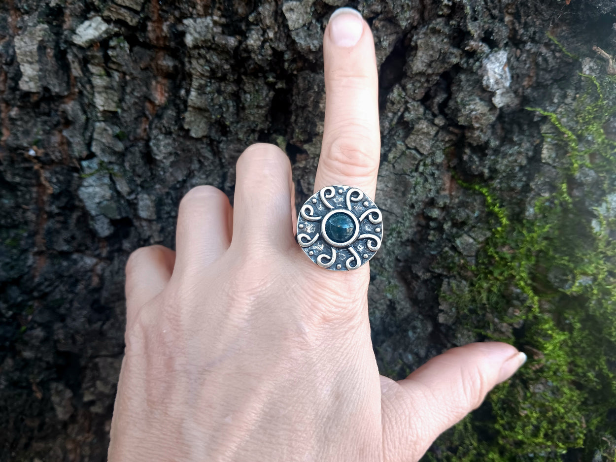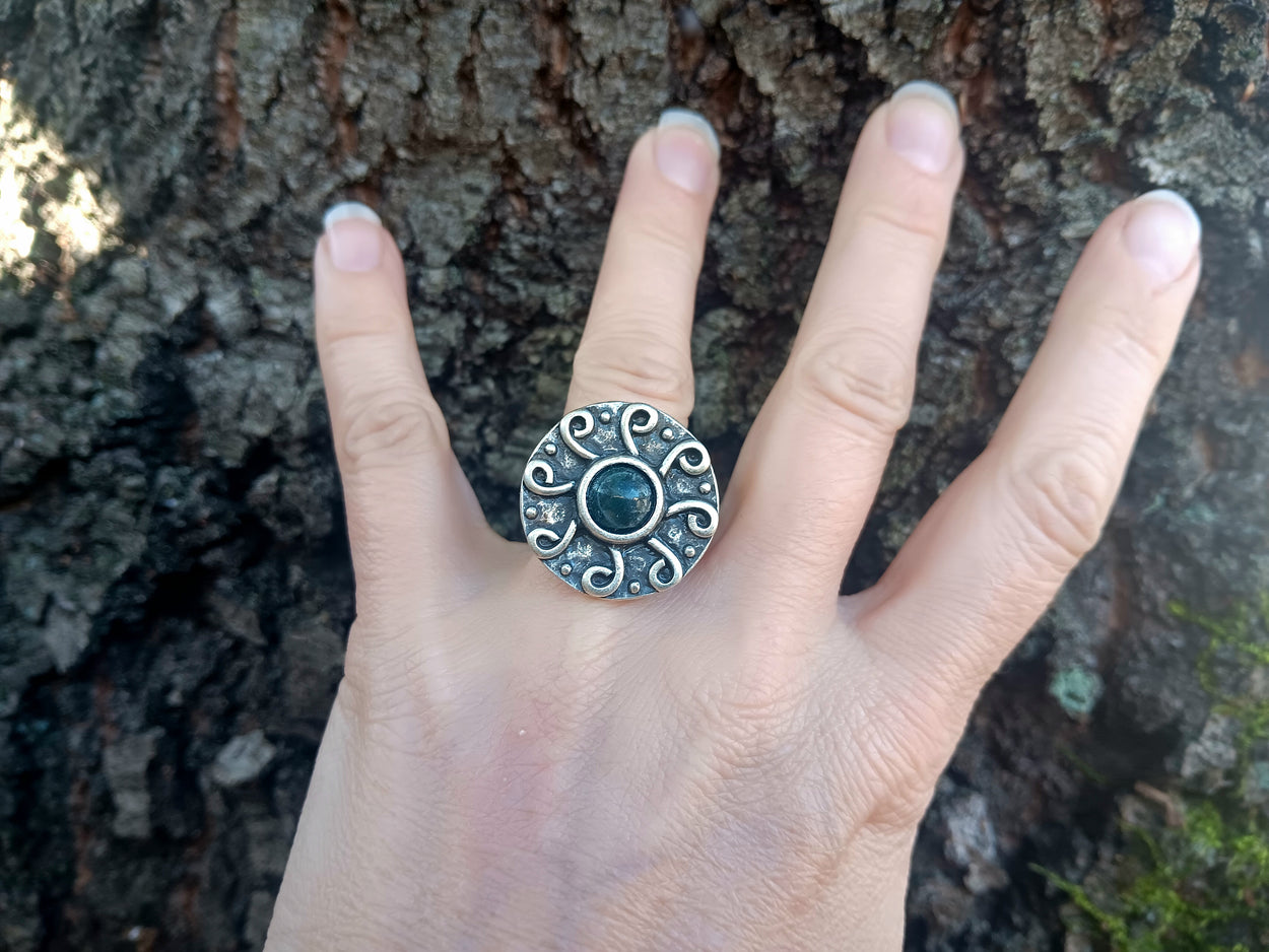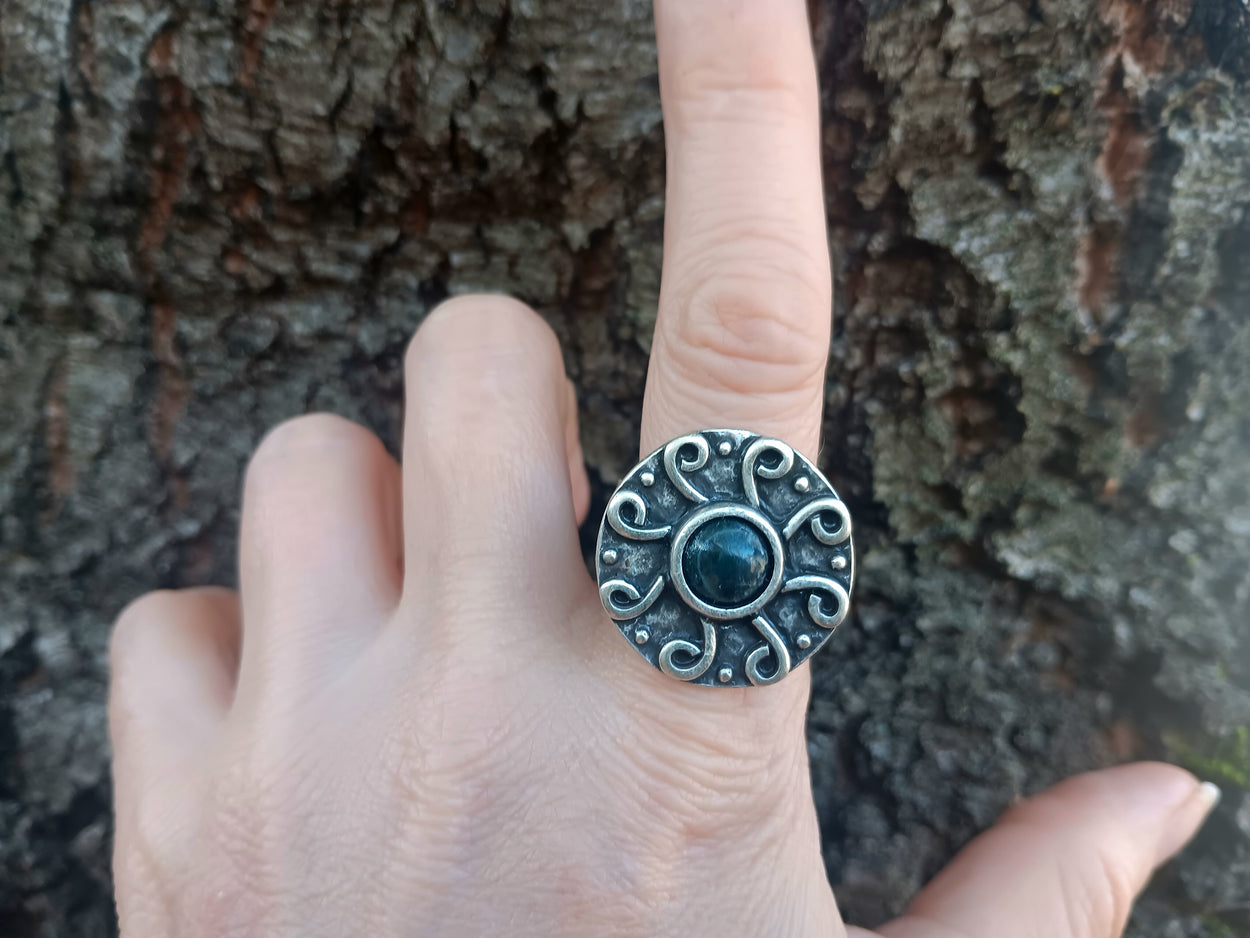 In a nod to David Lynch, who passed away today (at our time of writing), we've named this lovely, ethereal, cocktail ring after one of our favorite movies by the legendary director. The ring is set with a green fancy jasper, semi-precious stone that gives it a very earthy, yet otherworldly feel. The band is made of silver-plated brass and is adjustable for sizes 7 and up.