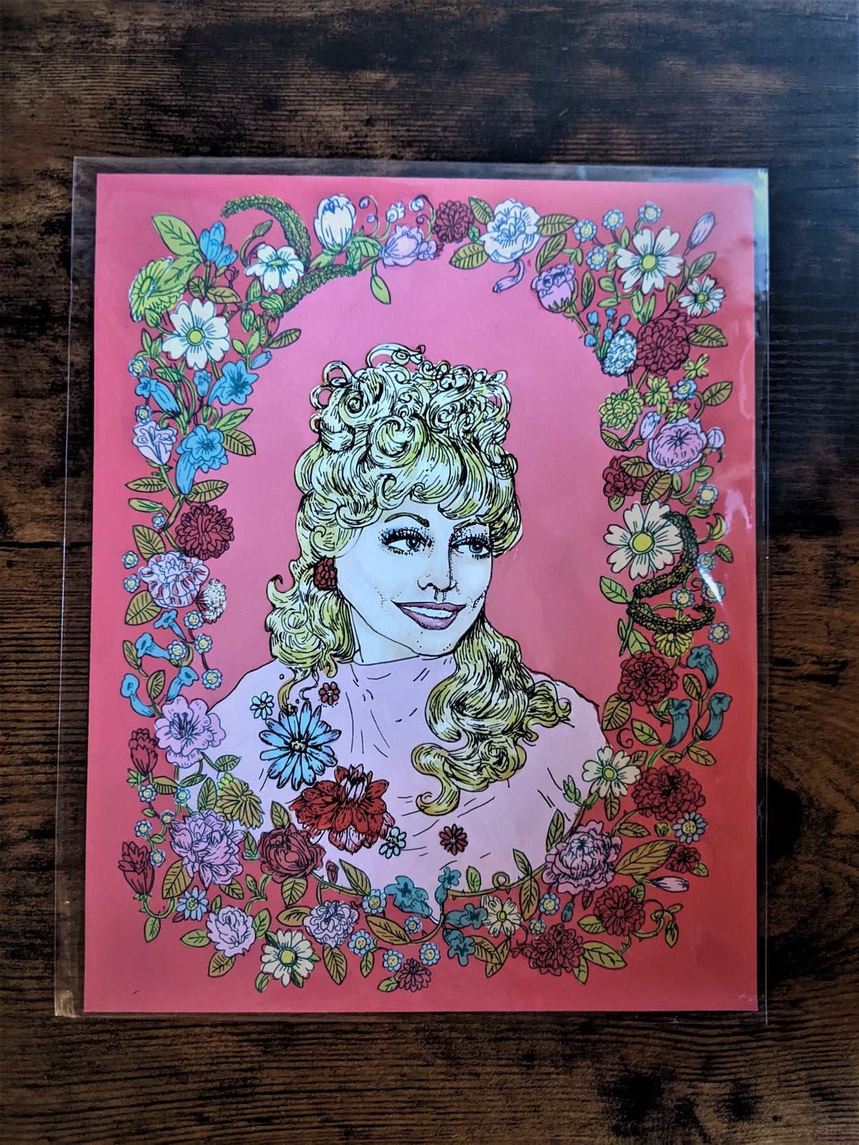 Hello Dolly! This is a beautiful art print by a local Brooklyn artist of the legendary queen of country herself, Miss Dolly Parton. If you'd like to see more artwork of this type, feel free to leave us a comment in our blog comments and tell us what you think! The print measures 8 by 10 inches.