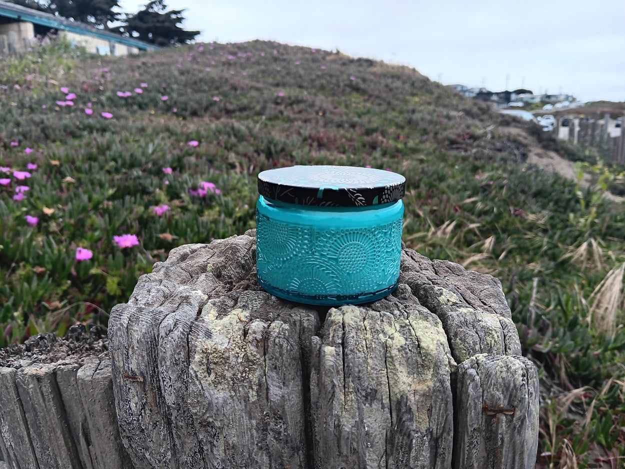 Like a field of lavender overlooking the ocean, this candle will surround you with the stench of the salty ocean air intertwining with notes of lemon and marine spray, transporting you to a summer beach.  The candle vessel is a beautiful light blue.  Scent Profile: Lavender* Green Moss* Salt Flower* Lemon. Made with a creamy coconut blended wax.  The fragrance is phthalate-free, paraben-free, carcinogen-free, mutagen-free, cruelty-free and vegan.   3.5 oz, comes with lid.