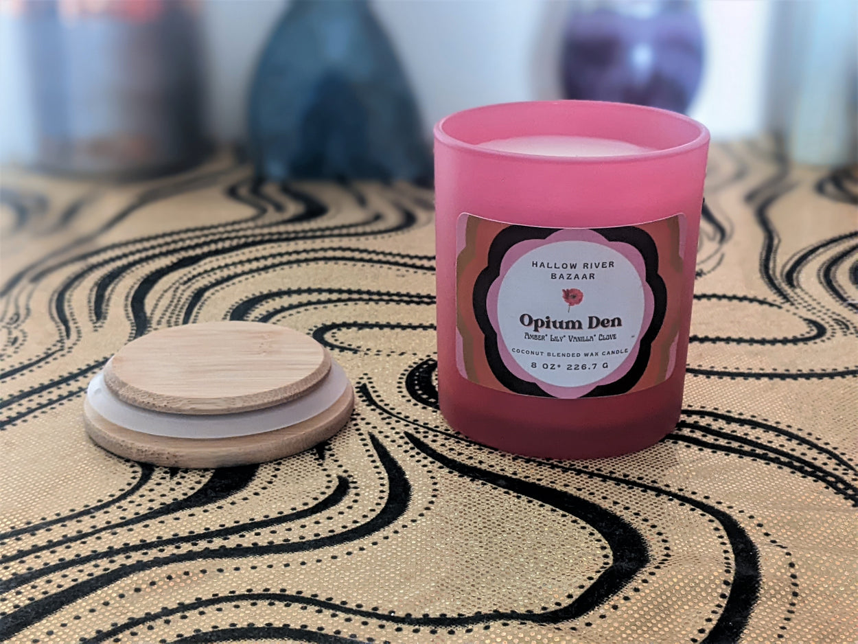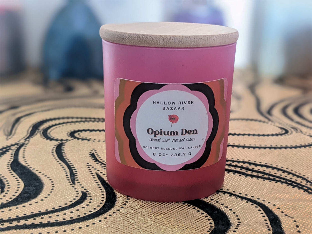 Inspired by the infamous dens of Manhattan's Chinatown during the 19th century, the scent captures the allure of the sweet taste of the drug that would lure unsuspecting victims into her deadly clutches. Scent Profile: Amber* Lily* Vanilla* Clove. The candle vessel is redish pink. Made with coconut blended wax. Phthalate free and prop 65 compliant. 8 oz, comes with a wooden lid.
