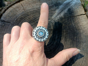 When choosing a stone for this celestial ring we imagined an alternate universe where the sun is made of ice. Rainbow moonstone or white labradorite, has a luminous iridescence that gives it otherworldly, or ethereal feel to it. The ring band is made of antiqued silver-plated brass and the stone is a natural 8mm rainbow moonstone. The ring is adjustable for sizes seven and up.