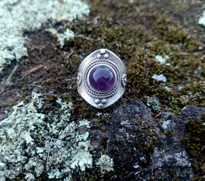 Purple is said to be the color of royalty.  Purple amethyst is thought to offer protection and promote spiritual awareness.  Our Royal Flush Cocktail Ring is designed to offer protection for your royal and spiritual aspirations.  The ring features a 10mm natural amethyst and the band is made of antiqued-silver-plated brass.  Size 7 - though note, the ring is slightly adjustable.
