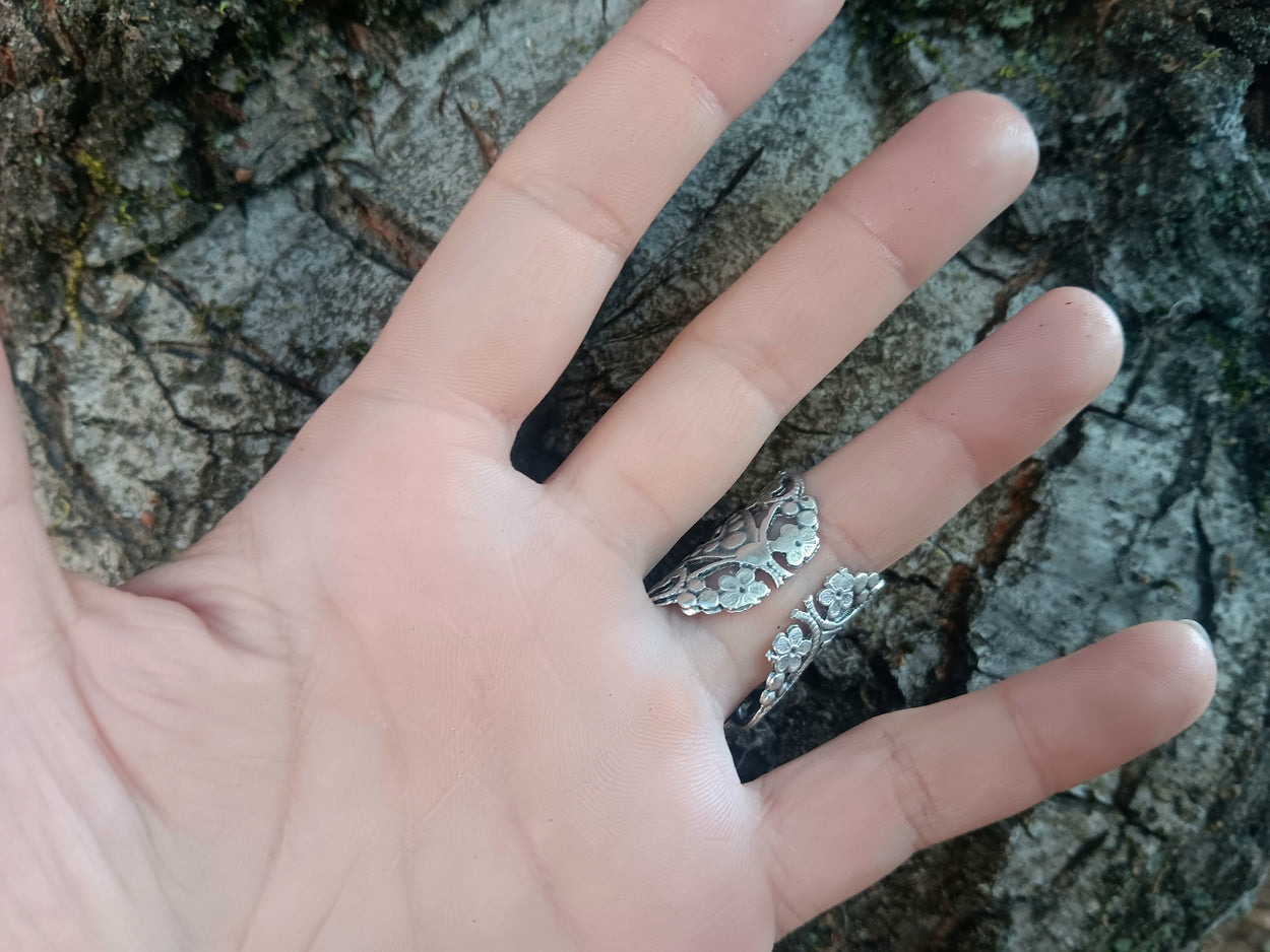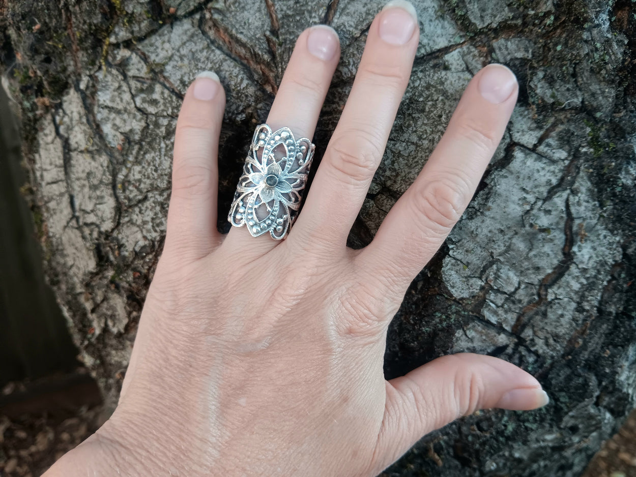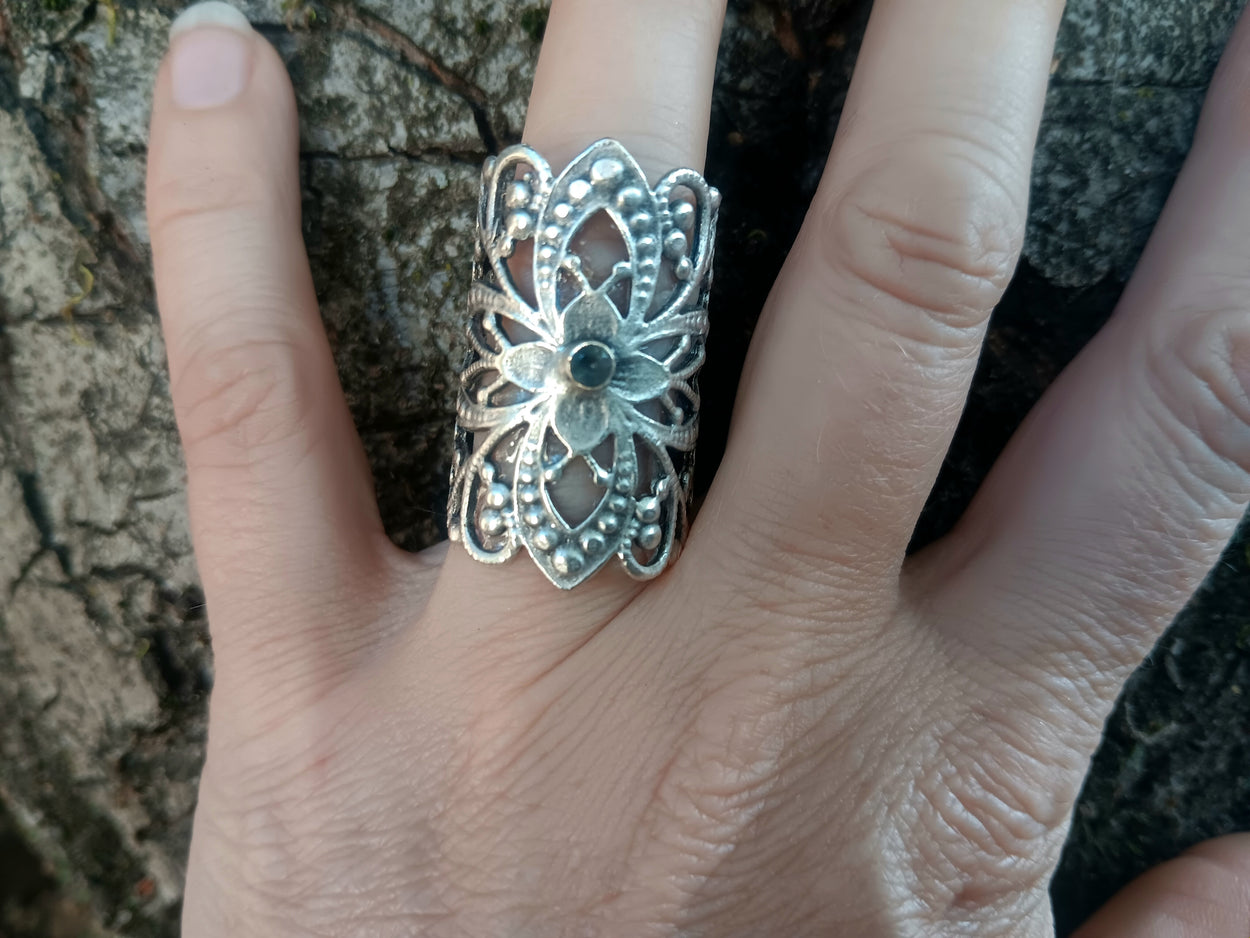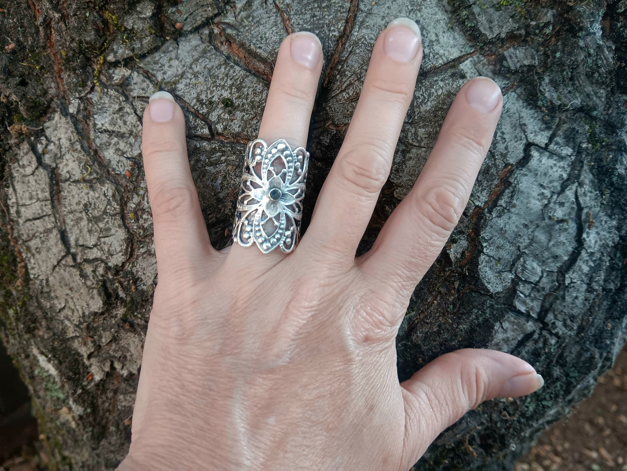 Spinel is our personal favorite gemstone and gray is a rare color that adds to the ethereal glow of our Dacing Flower Ring.  We embedded the 3mm natural, faceted stone in the floral motif to lend to the sensation of a dancing flower.  The ring is adjustable for sizes five and up and is made of silver-plated brass.
