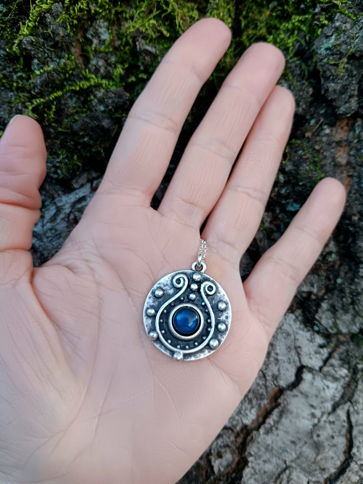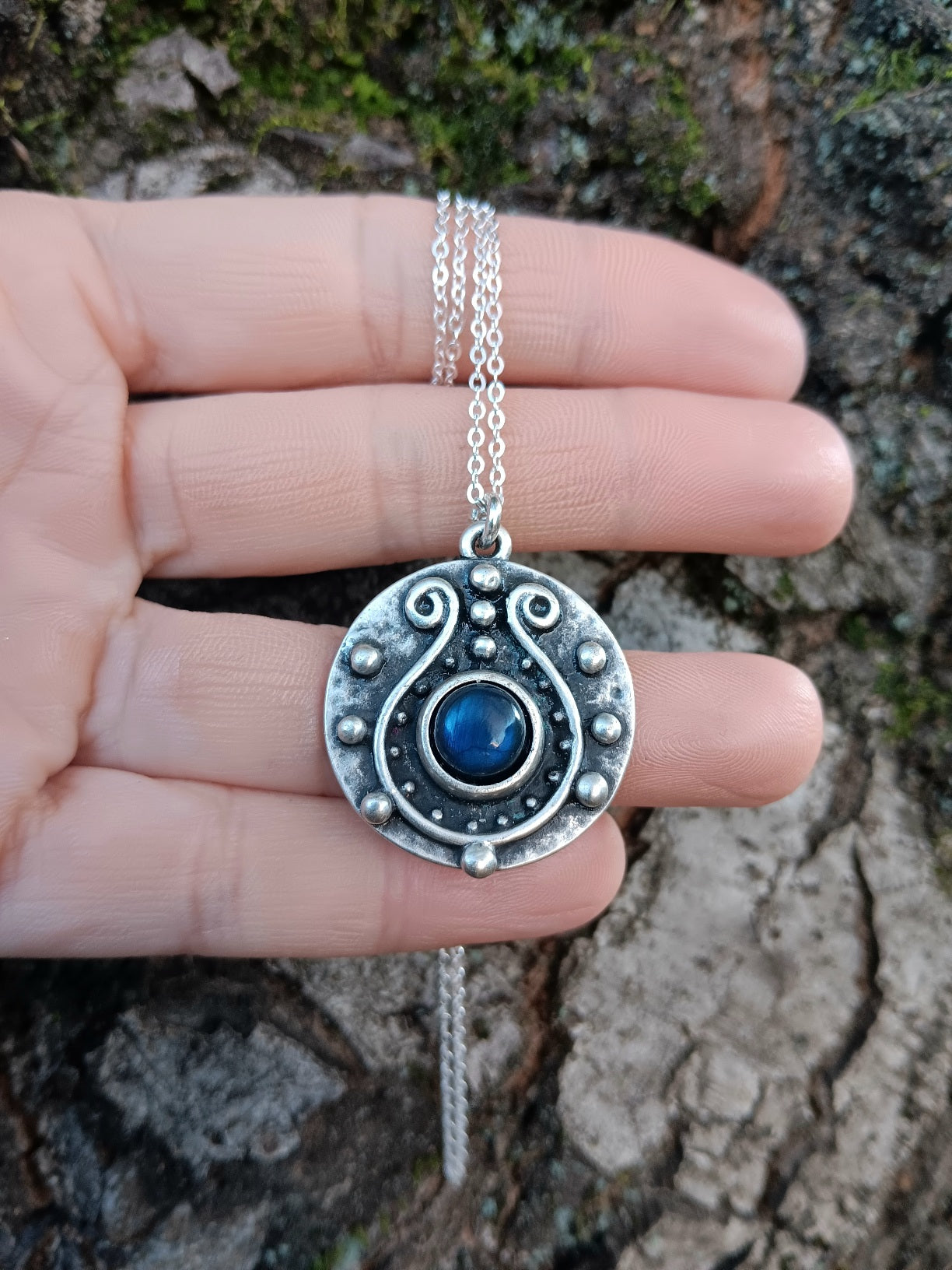 Labradorite is a gemstone prized for it's ethereal iridescence.  Some cultures believe that it contains a fragment of the Northern Lights captured in stone.  Old European folklore suggests it wards off sorcery.  This lavalier is made of a natural 8mm blue labradorite and comes on an 18" sterling silver chain.  The pendant is crafted of antiqued-silver-plated brass.