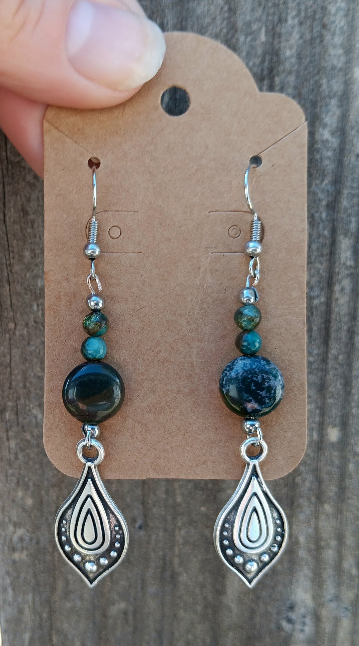 These earrings are hand-crafted using natural fancy jasper, semi-precious stones.  The earrings are approximately 2 3/4 inches in length and are made with stainless steel earring wire.  All of our earrings come with earring backs.