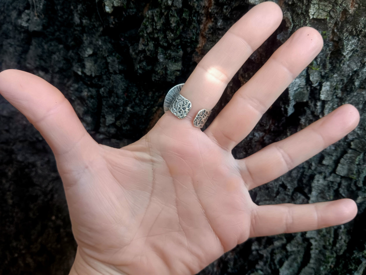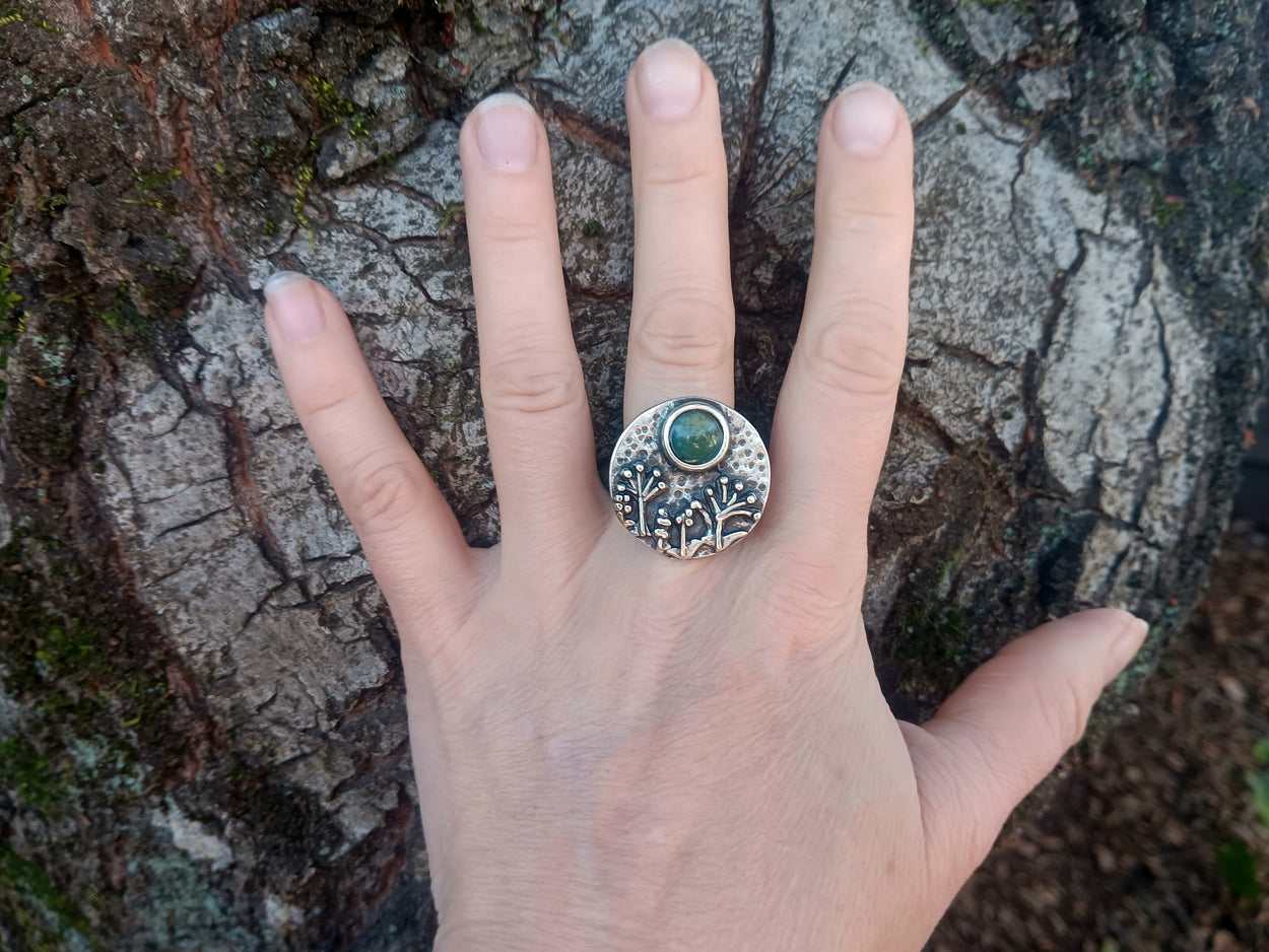 Another one of our pieces inspired by nature, our Floral Dream Cocktail Ring is set with a lovely, natural, green, fancy jasper stone.  The stone is 8 mm and the ring band is made of antiqued silver-plated brass.  The ring is adjustable for sizes 6.5 and up.