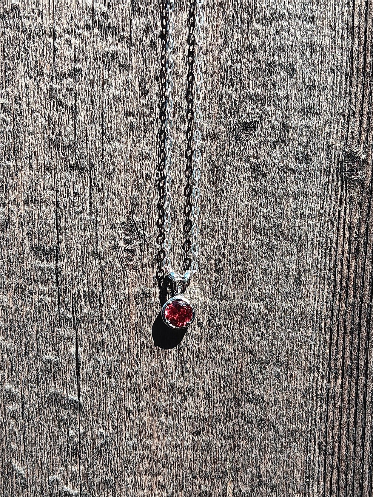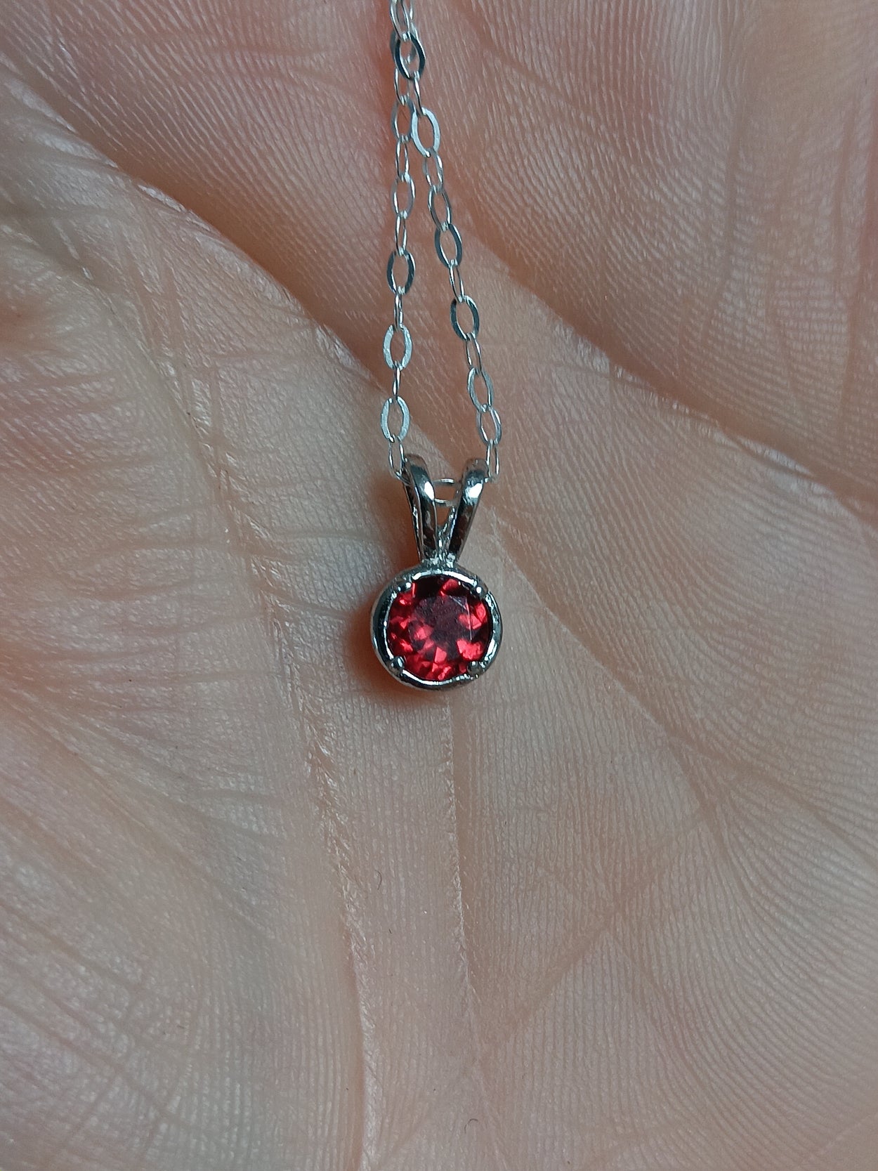 Genuine garnet and sterling silver necklace comes on an adjustable (18-20") 1.3 mm sterling silver chain.  Garnet pendant is 5 mm.