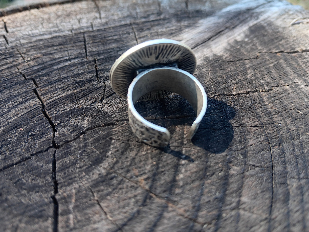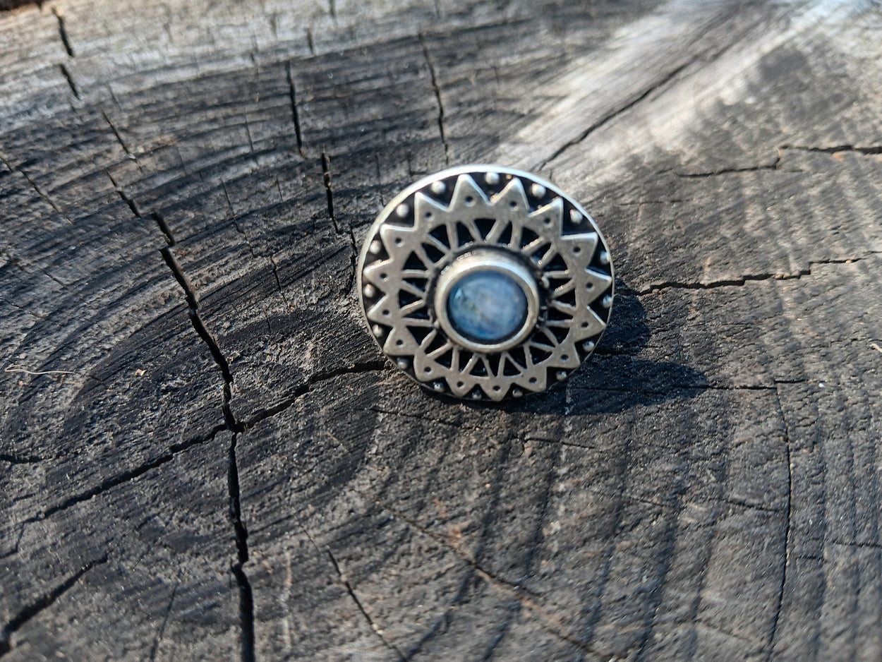 When choosing a stone for this celestial ring we imagined an alternate universe where the sun is made of ice.  Rainbow moonstone or white labradorite, has a luminous iridescence that gives it otherworldly, or ethereal feel to it.  The ring band is made of antiqued silver-plated brass and the stone is a natural 8mm rainbow moonstone.  The ring is adjustable for sizes seven and up.