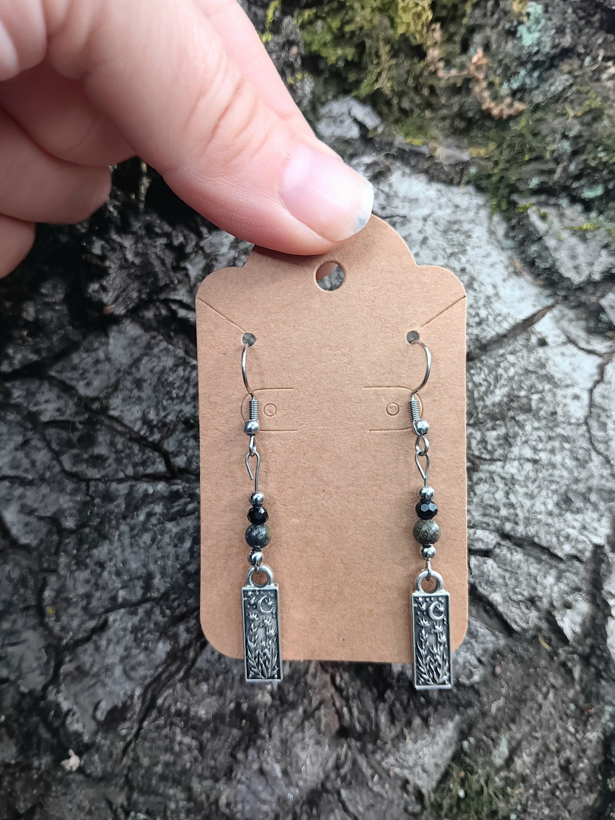 Night time is the right time with our nature inspired Moonlit Night Earrings!  They feature natural dragon's blood stone and sparkly glass beads.  The earring wire is made of stainless steel and the earrings measure appx. 2 1/4 inches.  All of our earrings come with earring backs.