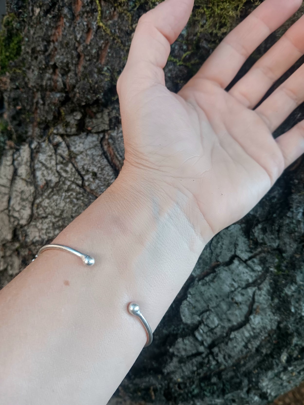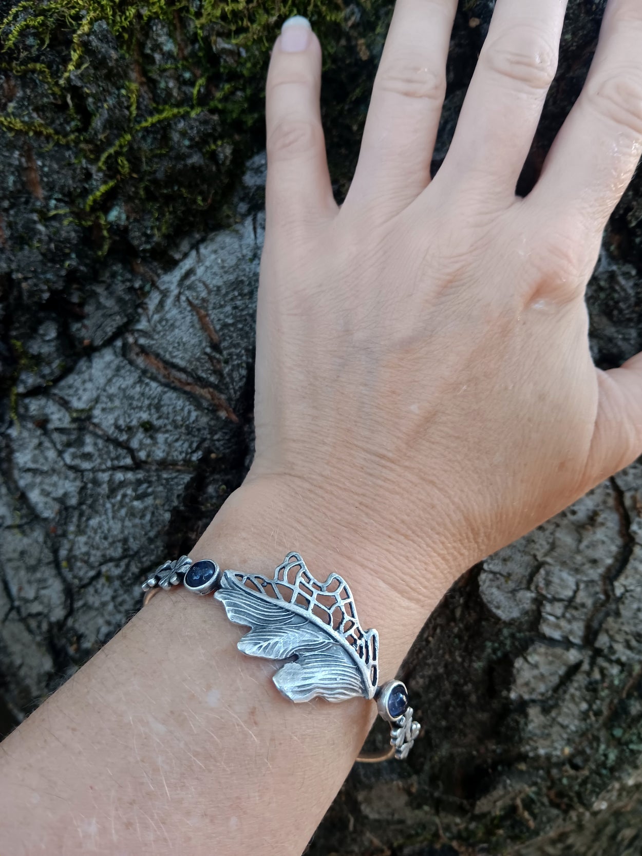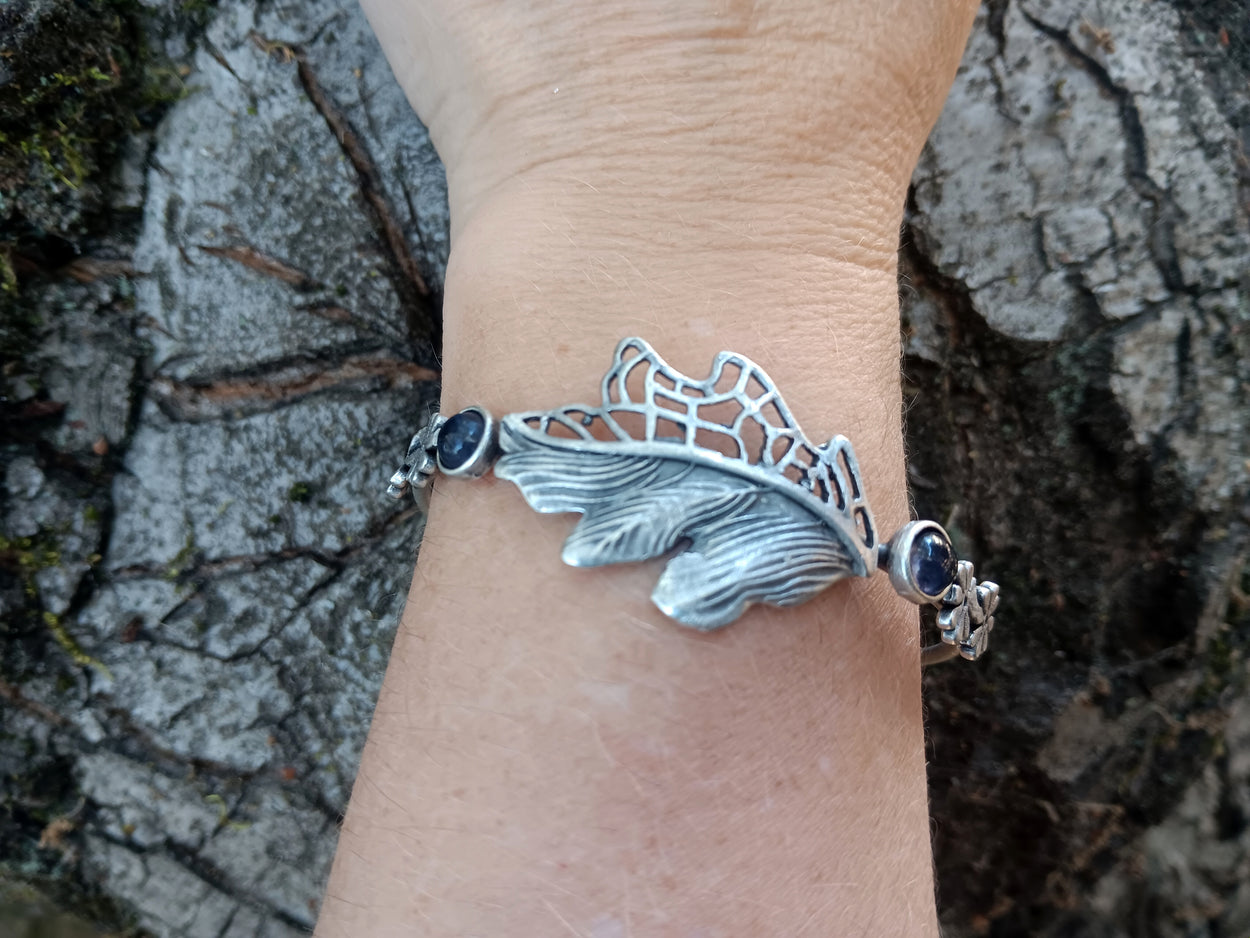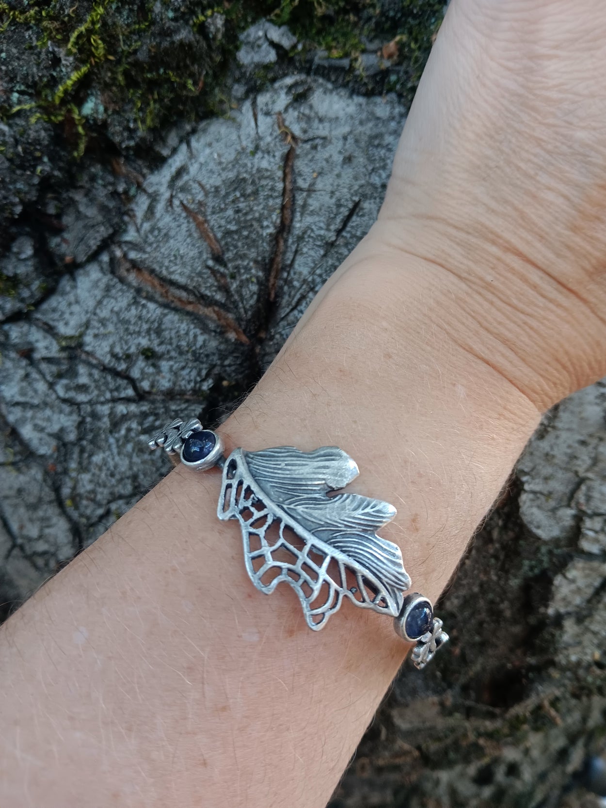 Another piece inspired by nature, our Oak Leaf Bracelet resembles a leaf of a White Oak tree.  When choosing gemstones, instead of going with a green stone, we opted for a majestic shade of purple with the two 6mm natural iolate stones that sit on each side of the leaf motif.  The bracelet is made of antiqued silver-plated brass and the size is adjustable.