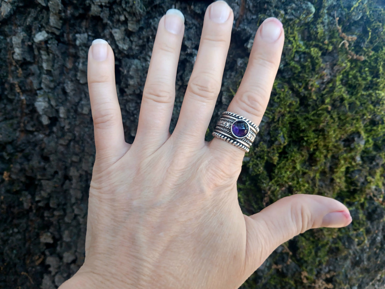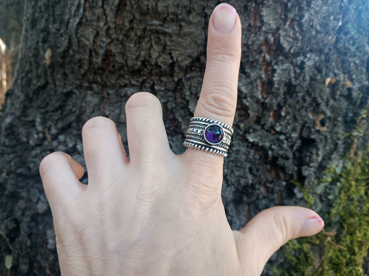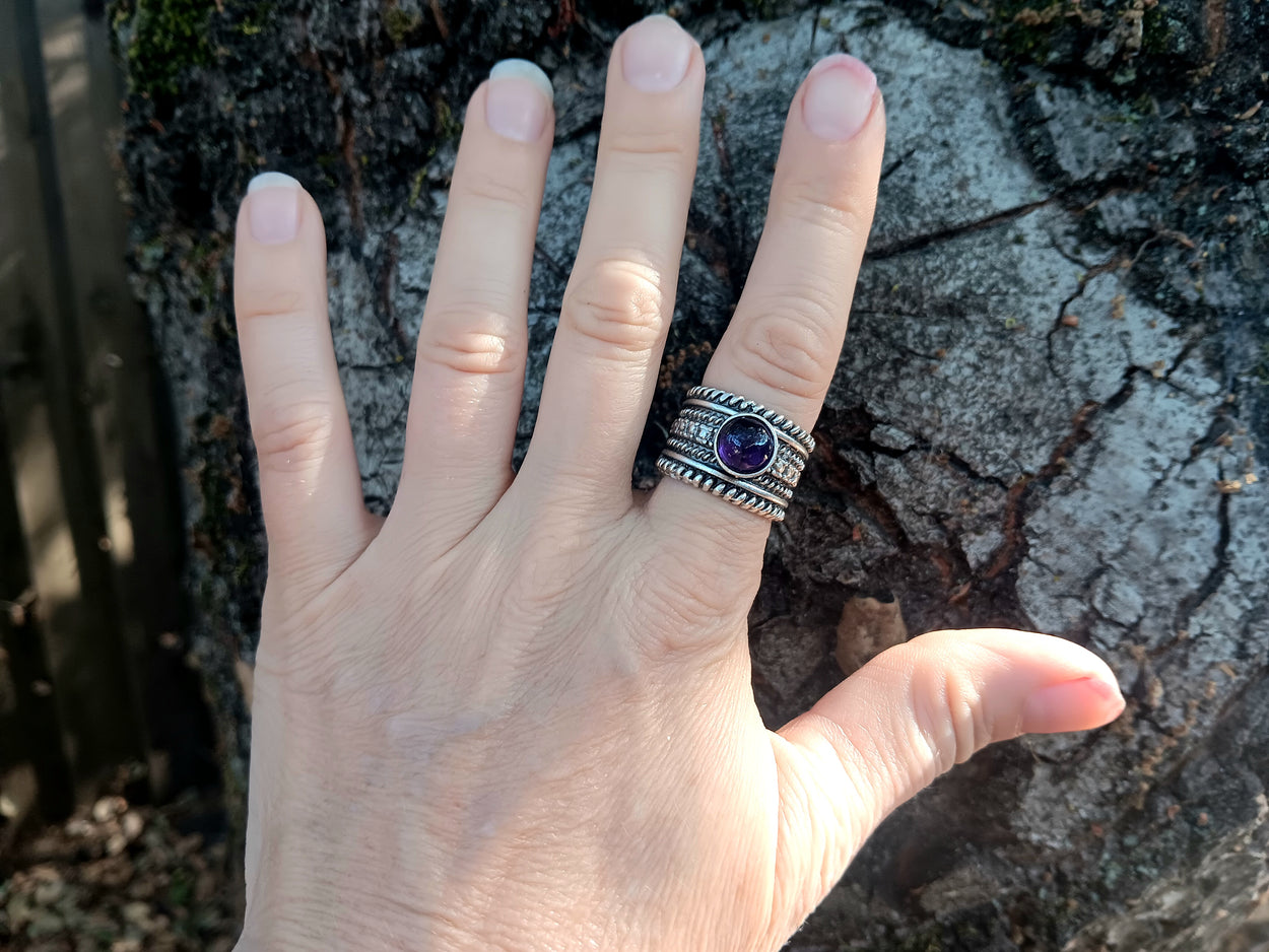 Purple Amethyst is a stone associated with royalty and is thought to be a protection stone, worn to provide both spiritual and emotional protection.  Cleopatra is believed to have had her drinking chalice made with amethyst as it's also thought to protect its user from getting drunk.  It's additionally believed to attract love and happiness.  The stone is natural, 8 mm in circumference and the  ring is adjustable for sizes five and up.  Made with silver-plated brass.