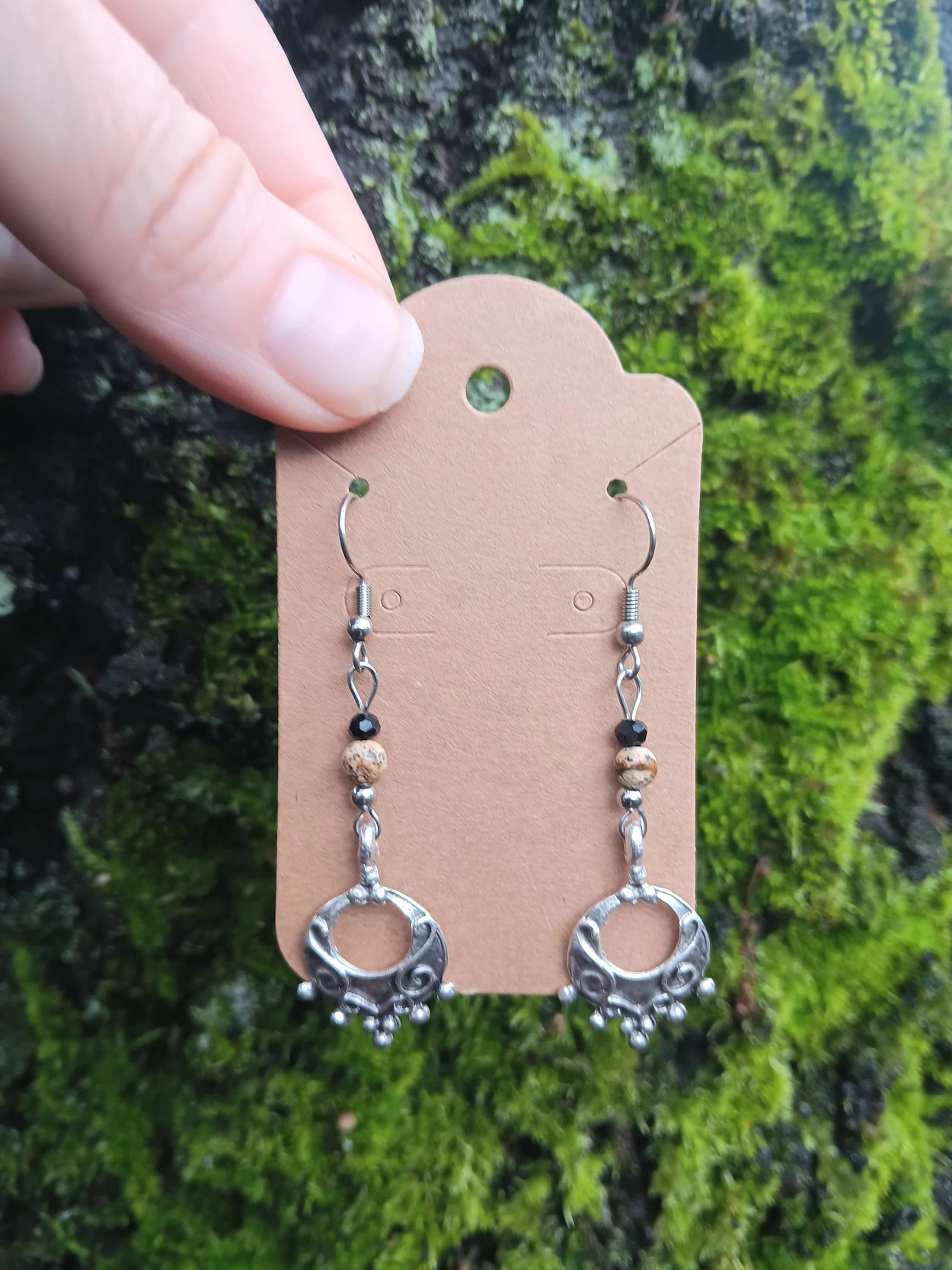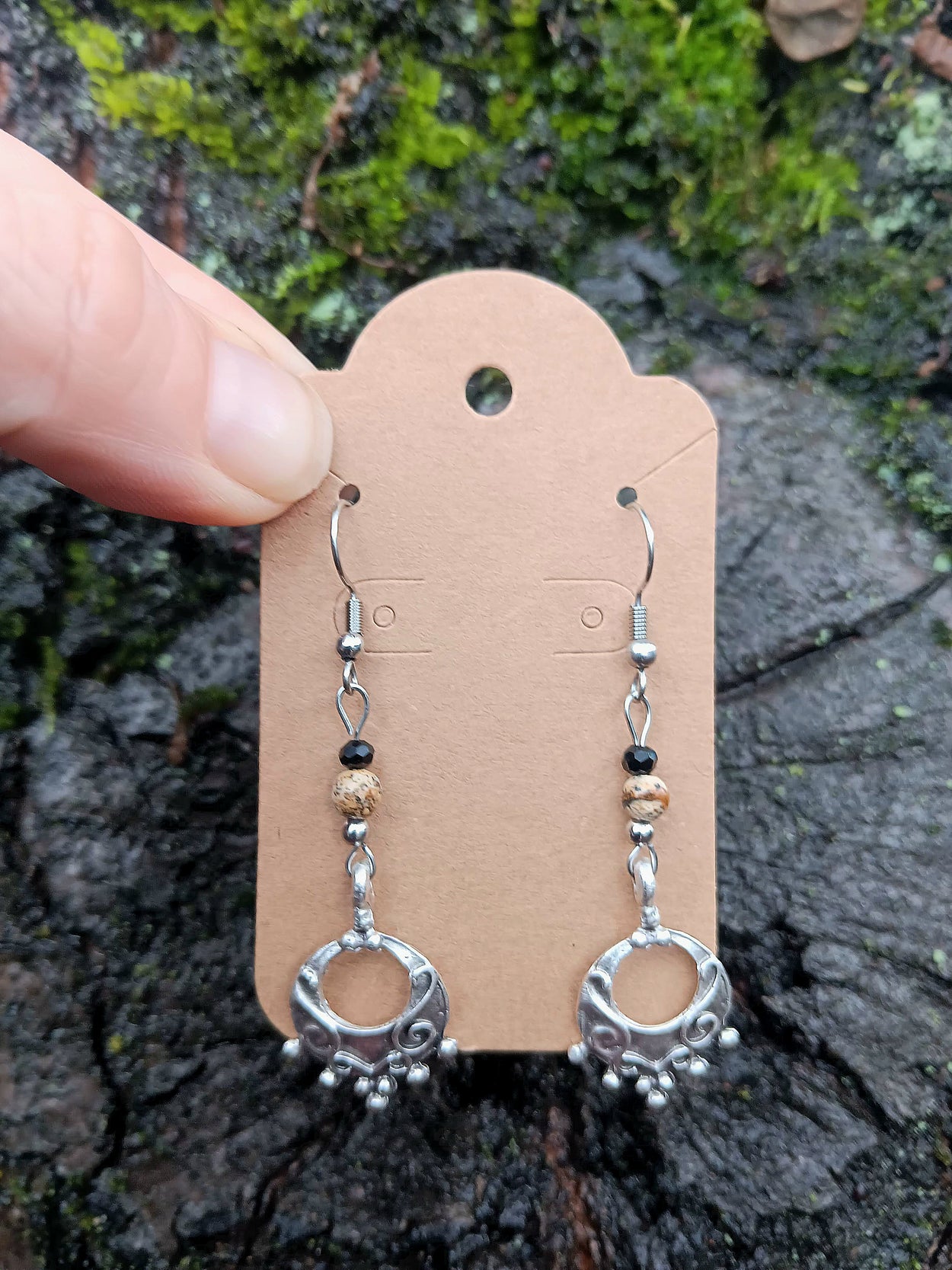 If you're looking for a pair of earrings that are Simply Elegant, you can't go wrong with this lovely, unique pair.  Made with natural picture jasper semi-precious stone beads and stainless steel earring wire.  The earrings measure approximately 2 1/4 " in length and come with earring backs.
