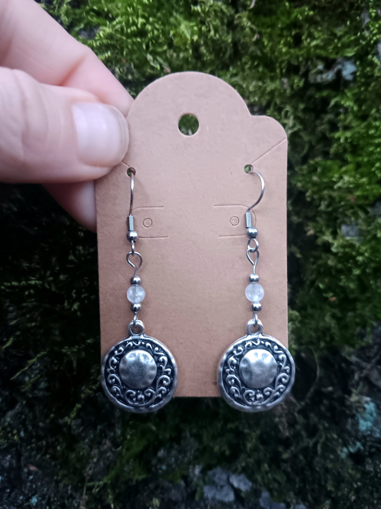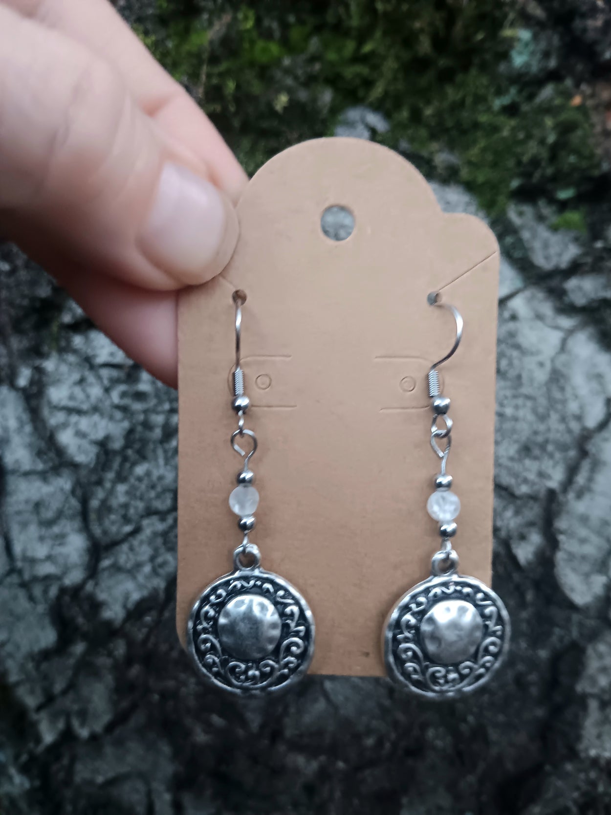While trying to come up with a name for these pair of earrings, a song got stuck in our head. White Light/ White Heat by The Velvet Underground. It somehow feels fitting because the white light/ white heat that radiates from the natural crackle quartz, will tickle you down to your toes! These earrings are made with stainless steel earring wire and measure approximately 2 1/4 inches in length. All of our earrings come with earring backs.