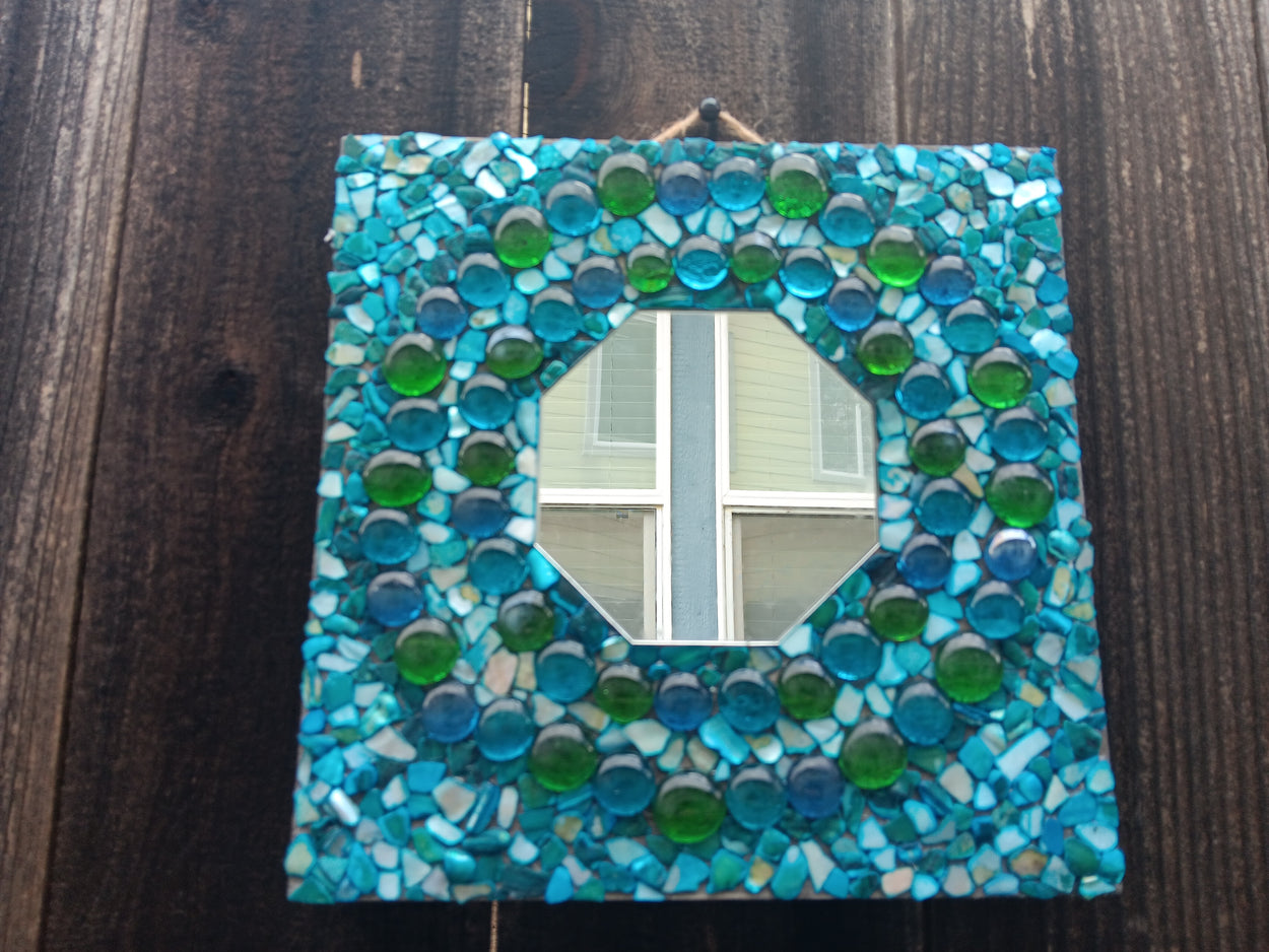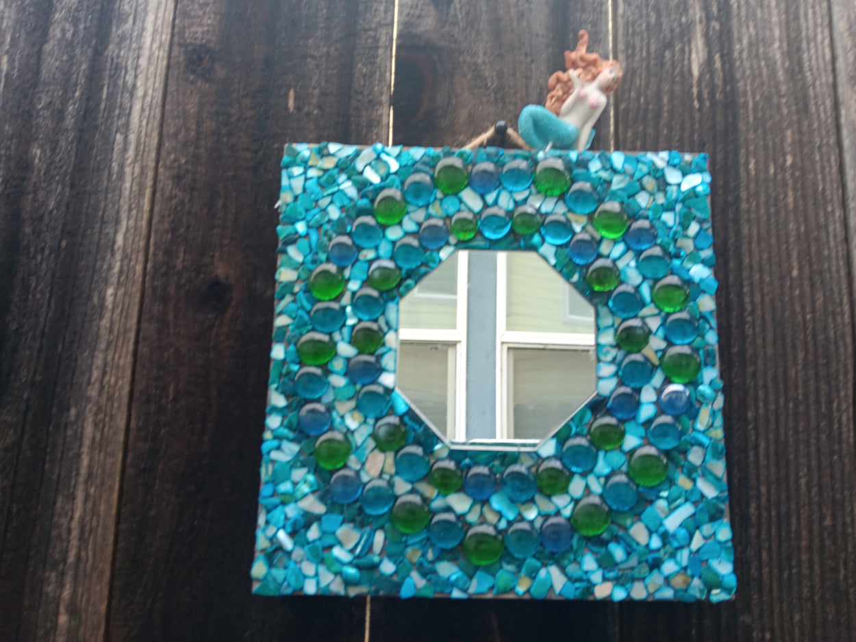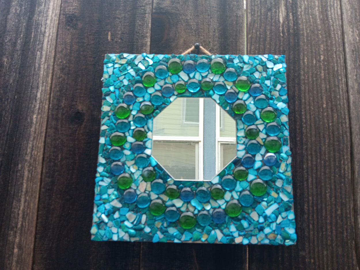 We're excited to list this stunning, handmade, mosaic mirror. It is made with beautiful pieces of blue and green glass gems and crushed turquoise, mother of pearl. The piece measures 10 x 10 and the mirror is 4.5 x 4.5.