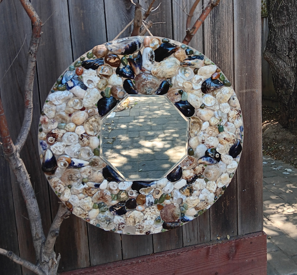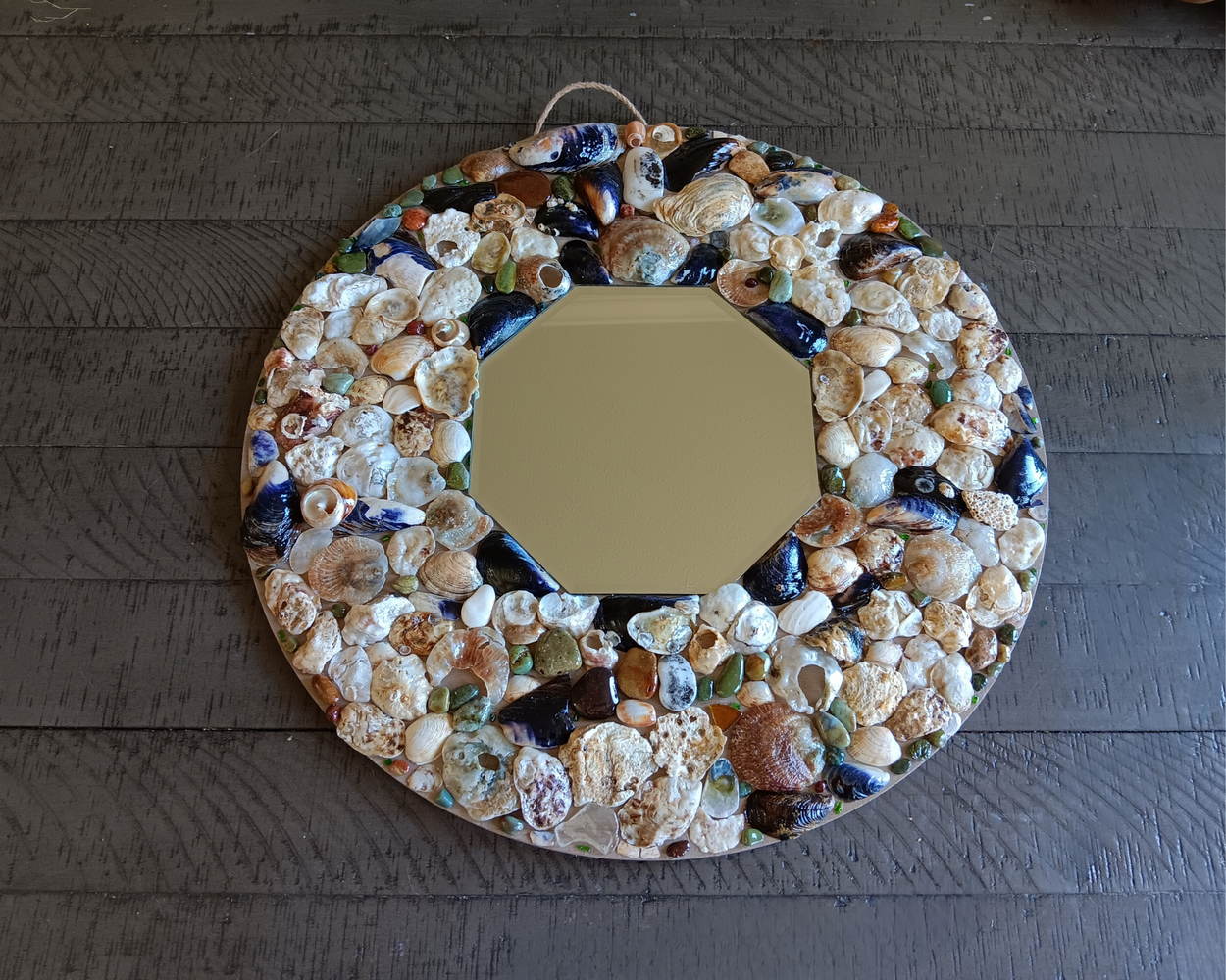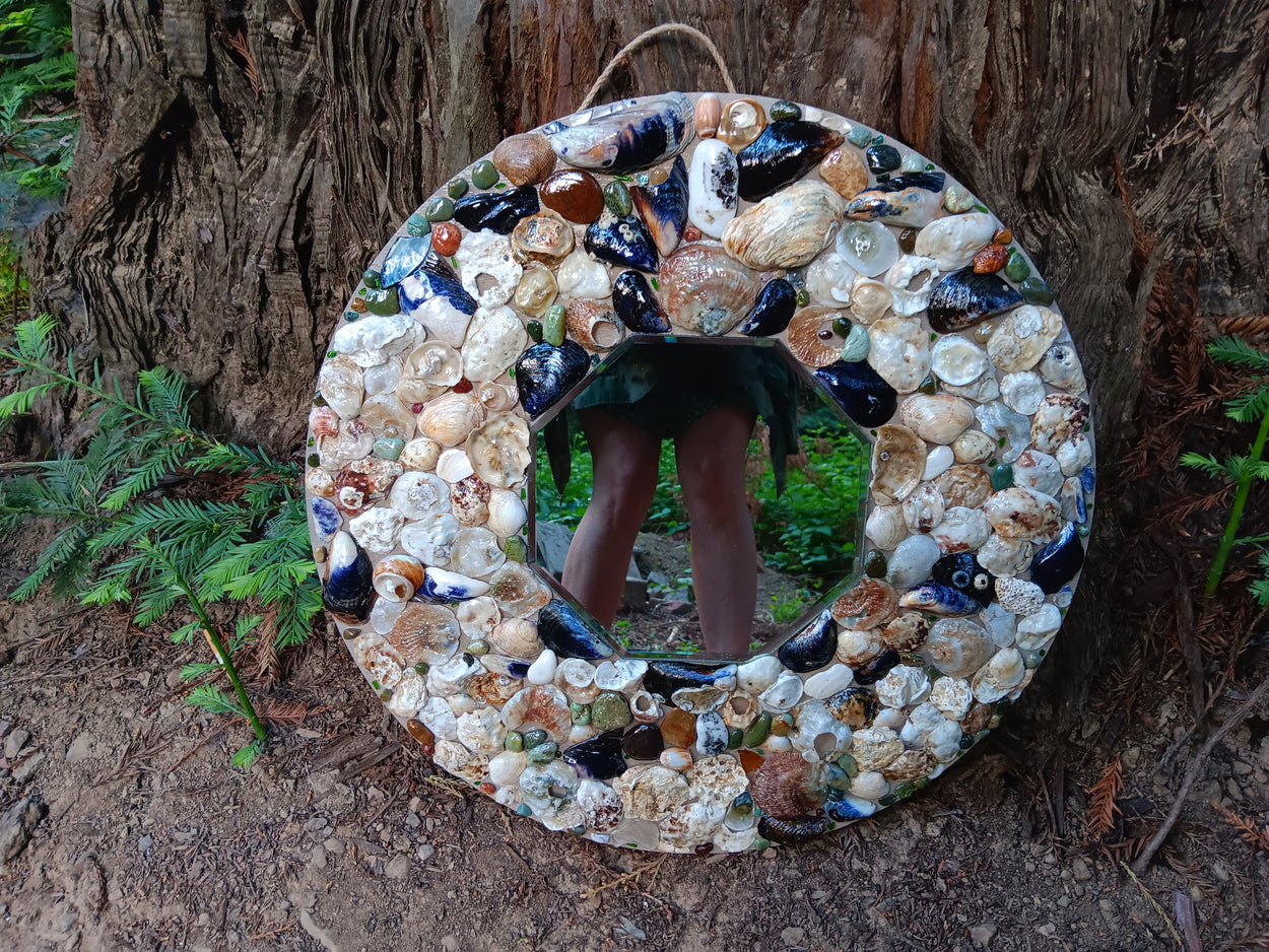 This is a one-of-a-kind, handmade, seashell mirror. It includes natural seashells, sea glass, and hand-collected semiprecious stones, including agate and jasper (etc). It additionally includes some rough chards of real emeralds, rubies, sapphires, and chrome diopside!! (See if you can find 'em)!! The total size of the piece is 18x18 and the hexagon shaped mirror is just a hair under 8x8. The piece comes with a hook for wall mounting. *Please note this piece is very fragile and we will only refund if damaged upon arrival!