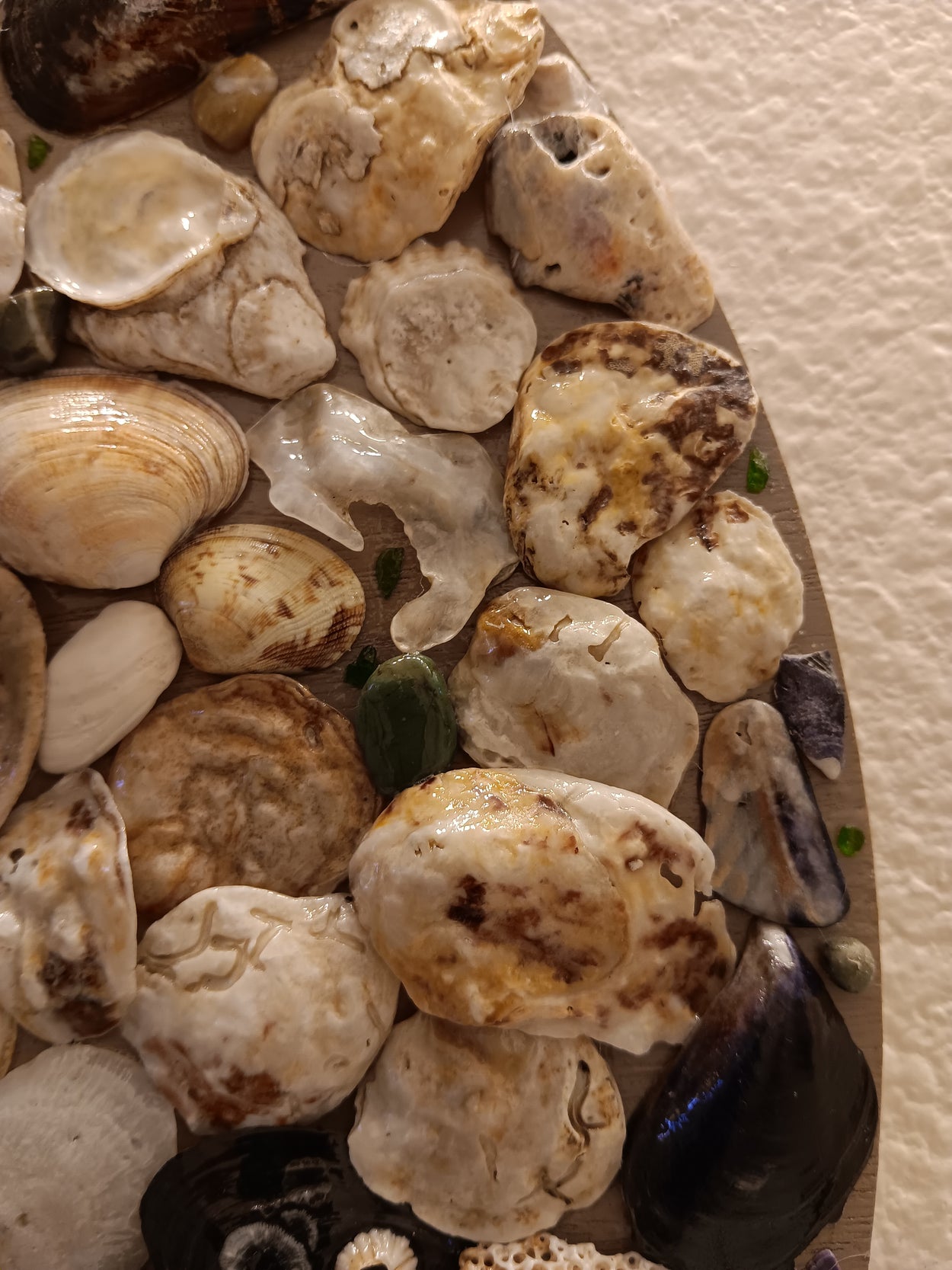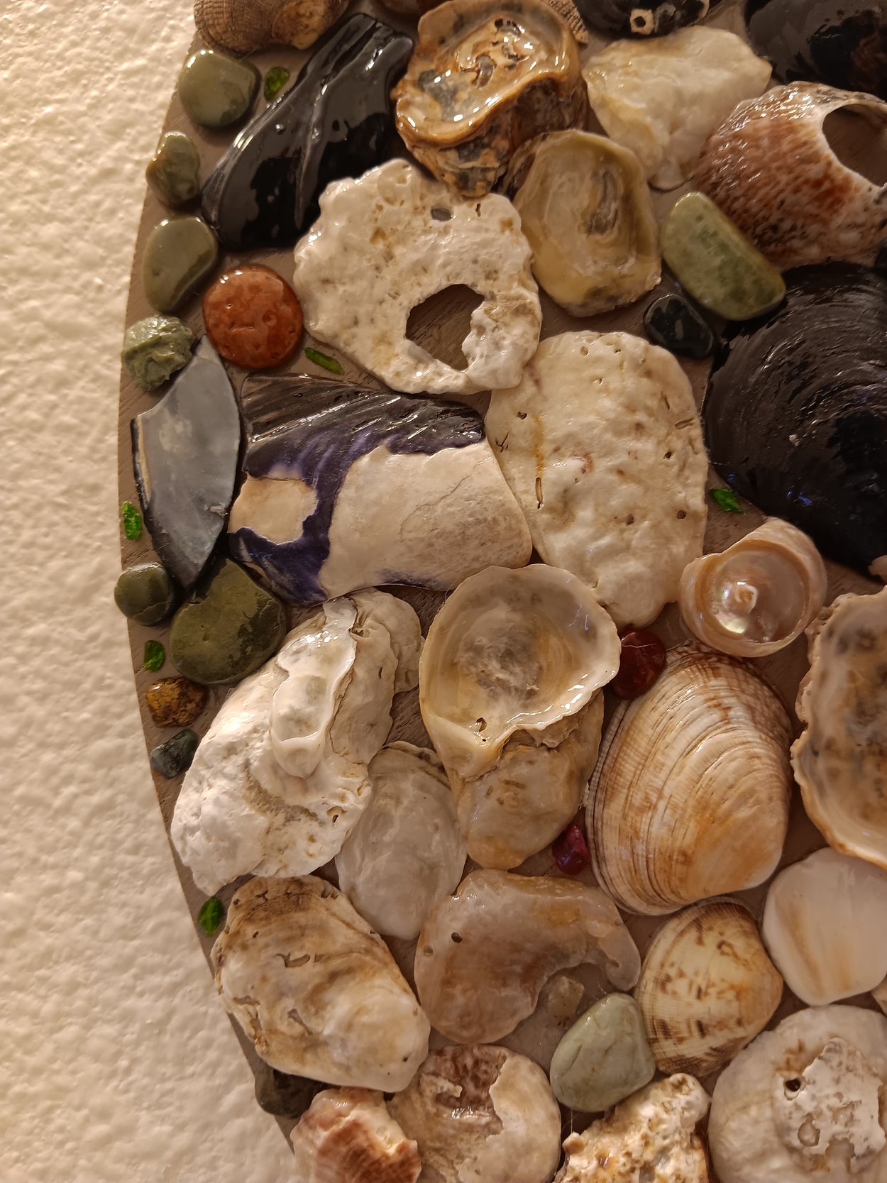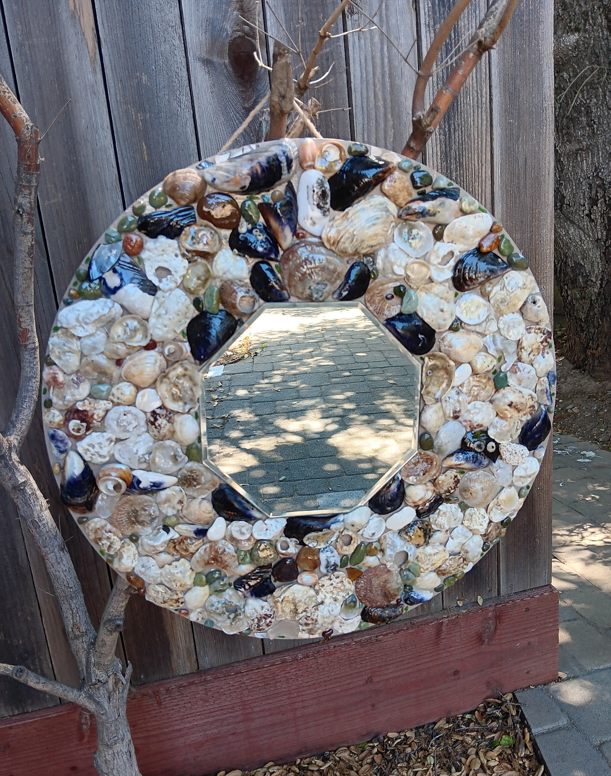 This is a one-of-a-kind, handmade, seashell mirror. It includes natural seashells, sea glass, and hand-collected semiprecious stones, including agate and jasper (etc). It additionally includes some rough chards of real emeralds, rubies, sapphires, and chrome diopside!! (See if you can find 'em)!! The total size of the piece is 18x18 and the hexagon shaped mirror is just a hair under 8x8. The piece comes with a hook for wall mounting. *Please note this piece is very fragile and we will only refund if damaged upon arrival!