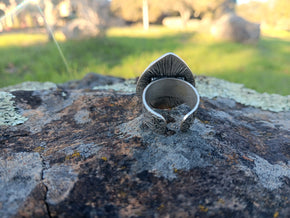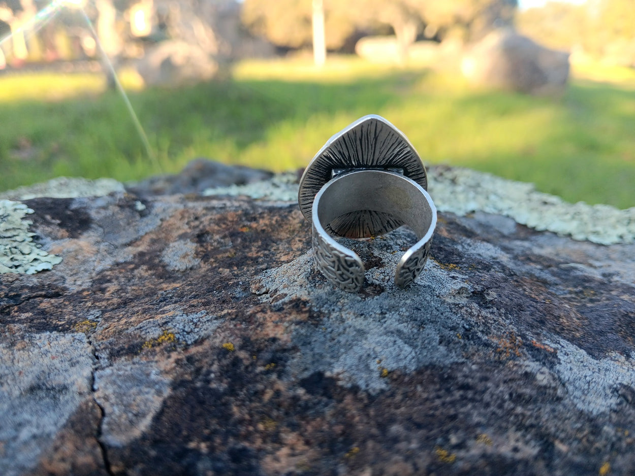If you've ever heard the term once in a blue moon, it could be used to refer to the rare blue supermoon that comes out when the earth, sun and moon are perfectly aligned, a rare occurrence. Inspired by this supermoon our Blue Moon Ring is designed to empower its wearer with clarity and the ability to manifest goals. Made with semi-precious, natural, blue apatite stone. Adjustable for sizes six and up. The ring base is made of antiqued-silver-plated brass and the stone is 10mm in circumference.