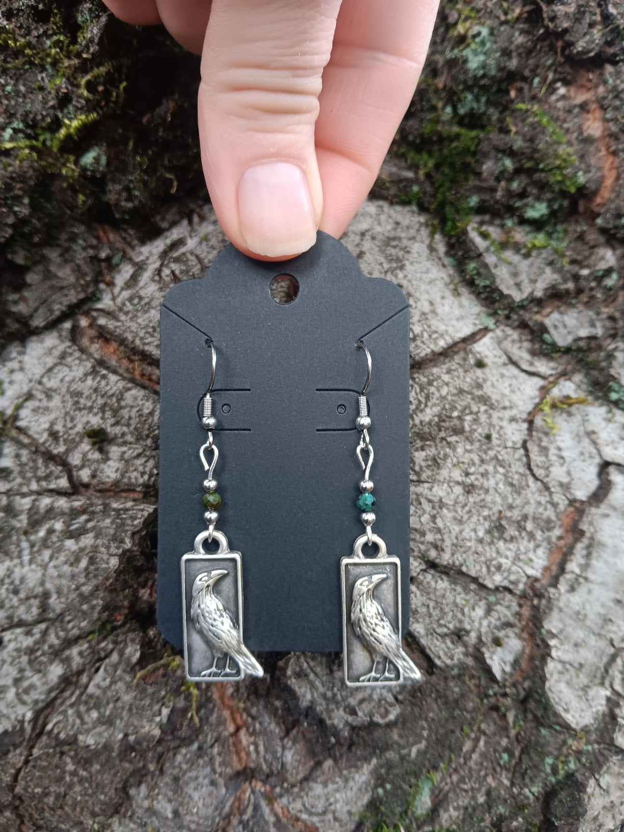 Have you ever caught the gaze of a majestic raven? These Poe inspired earrings are designed with natural green Hubei turquoise beads. They measure approximately 2 1/2 inches in length and are made with stainless steel earring wire. All of our earrings come with earring backs. *Please note that due to the nature of the natural stone, each turquoise bead is a slight variation in the shade of green.